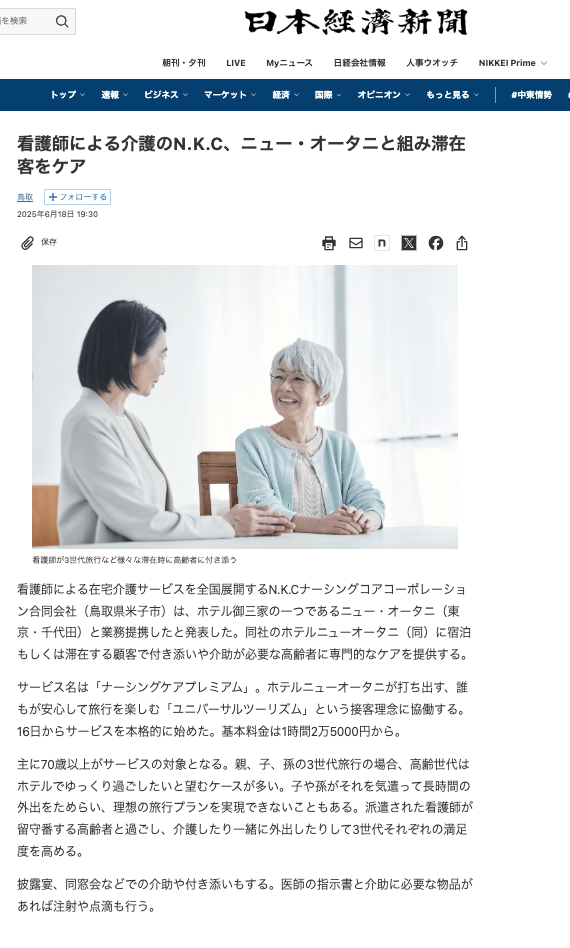 N.K.Cナーシングコアコーポレーション合同会社とニュー・オータニが業務提携し展開する新サービス「ナーシングケアプレミアム」について、日経新聞に掲載されました。